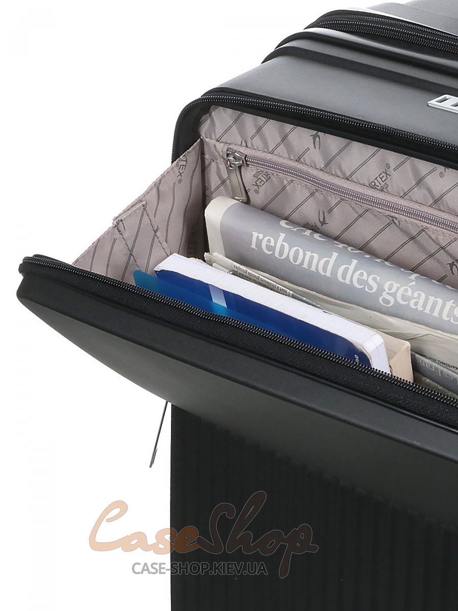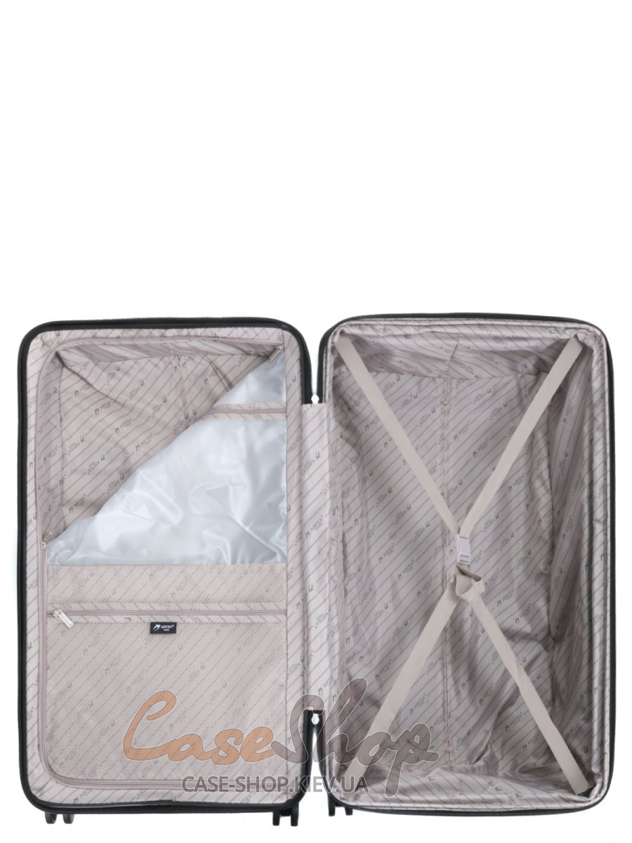 • Интерьер чемодана: Разделенное пространство с фиксирующими ремнями и дополнительными карманами на молнии.