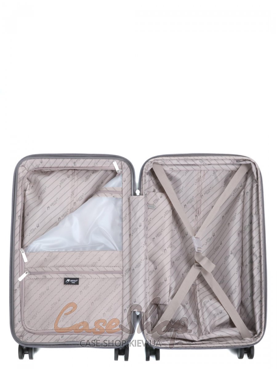 • Интерьер чемодана: Разделенное пространство с фиксирующими ремнями и дополнительными карманами на молнии.