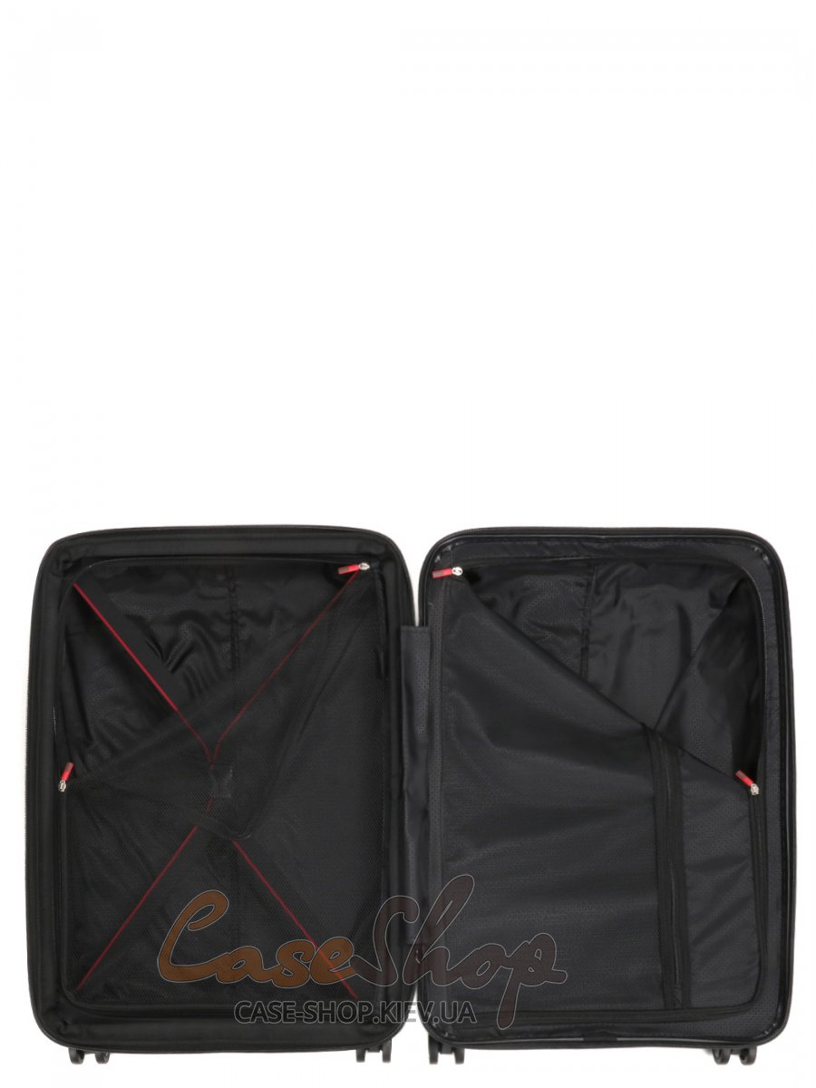 • Интерьер чемодана: Разделенное пространство с фиксирующими ремнями и дополнительными карманами на молнии.