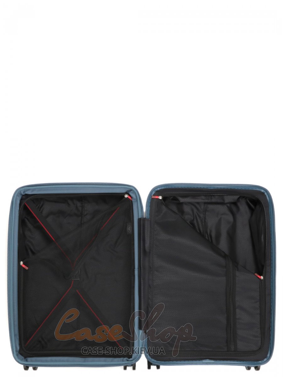 • Интерьер чемодана: Разделенное пространство с фиксирующими ремнями и дополнительными карманами на молнии.