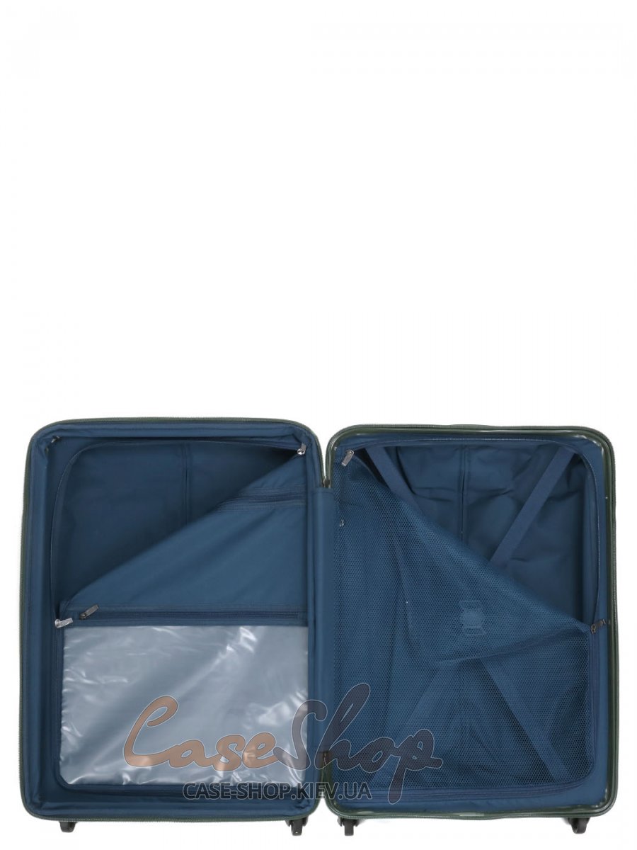 • Интерьер чемодана: Разделенное пространство с фиксирующими ремнями и дополнительными карманами на молнии.