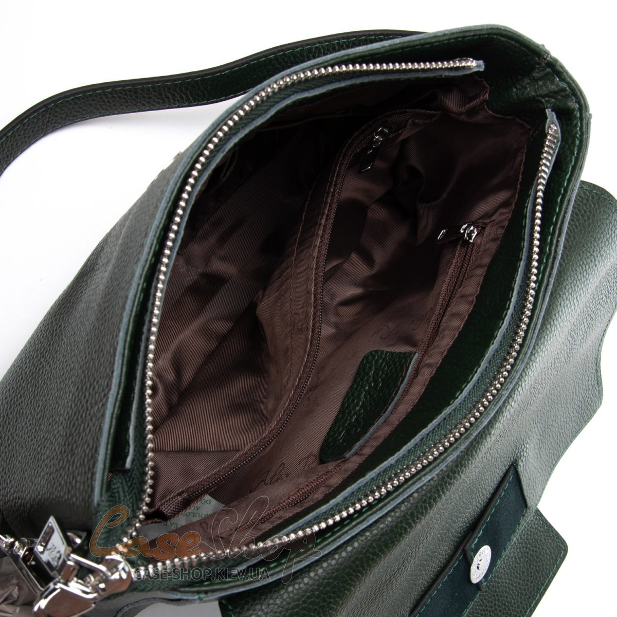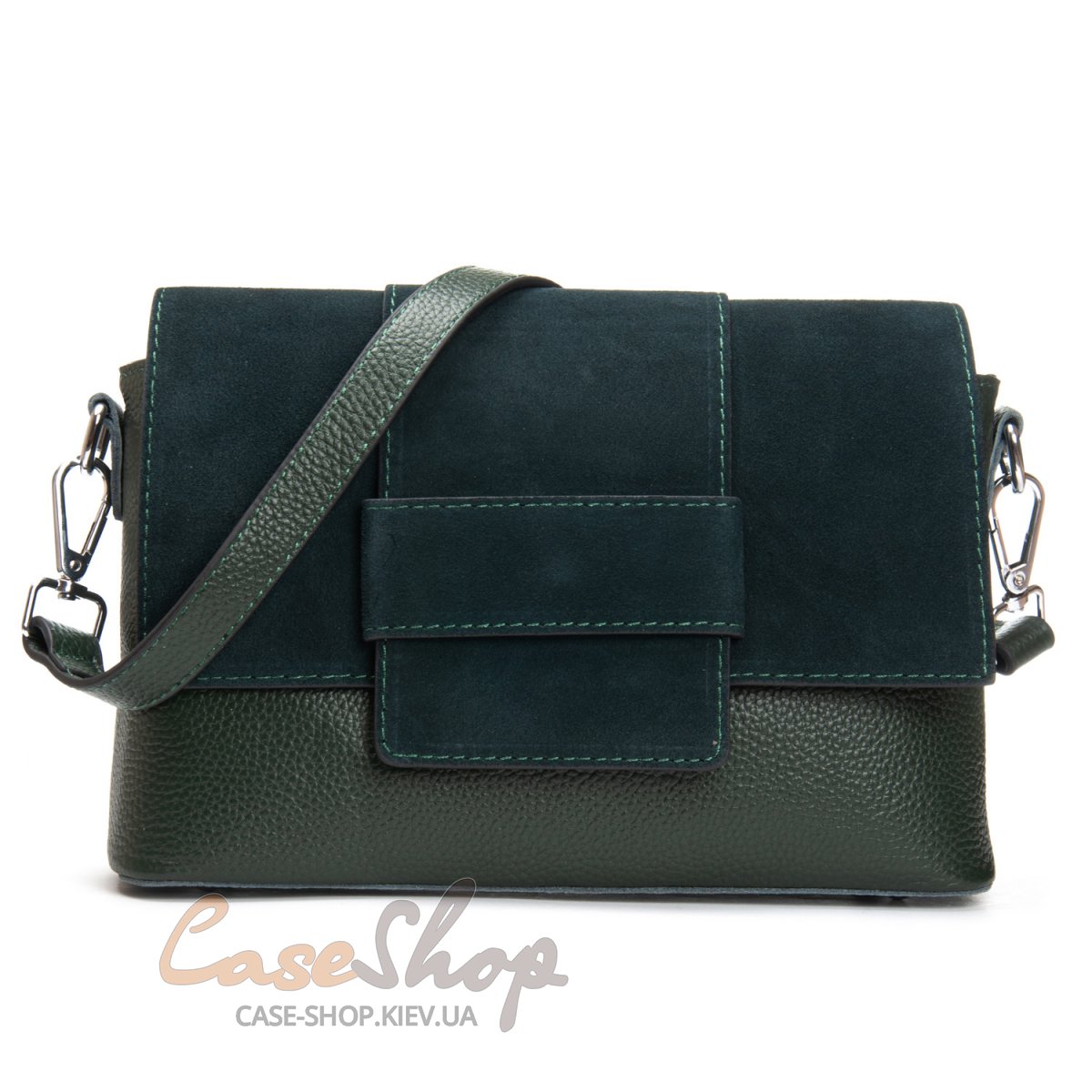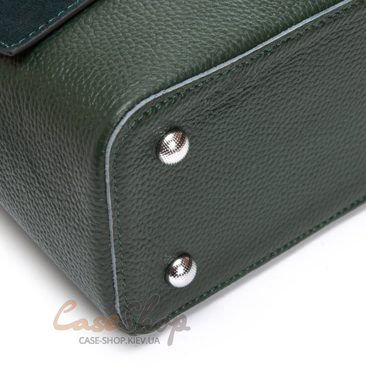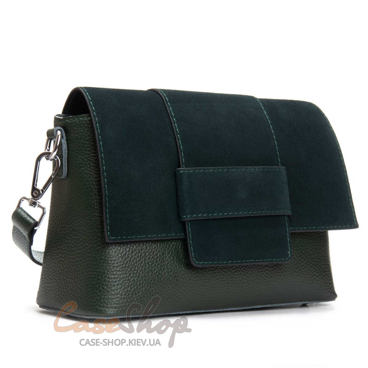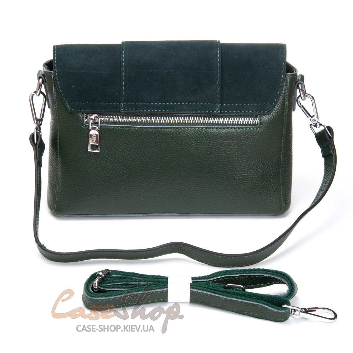 Женская сумка изготовлена из натуральной кожи и замши. Под клапаном сумка дополнительно закрывается на молнию. Внутри сумки находится одно отделение с карманом-перегородкой на молнии, открытым карманом и карманом на молнии. Снаружи сумки на обратной стороне расположен карман на молнии. Дно сумки жесткое, с металлическими ножками.