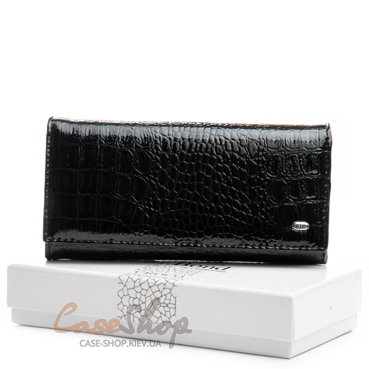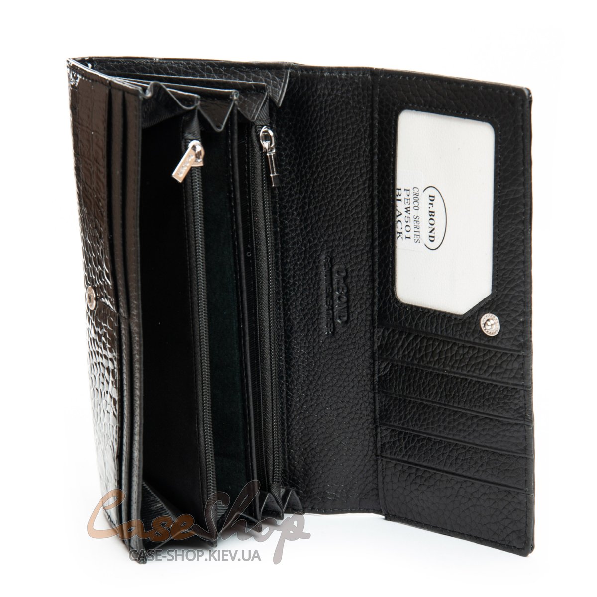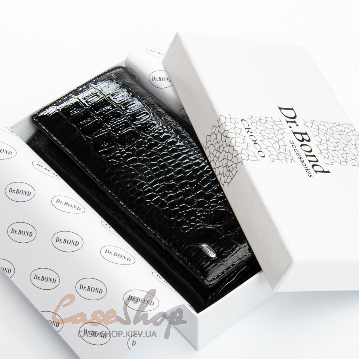 Великий полегшений жіночий гаманець Dr.Bond серії Croco . Виготовлений із натуральної лакової шкіри. Закривається на кнопку. Усередині знаходяться 4 відділення для банкнот, дві кишені-монетниці на блискавці, велика відкрита кишеня та 9 кишень для карток та візиток. Зовні гаманець на звороті має кишеню на блискавці.