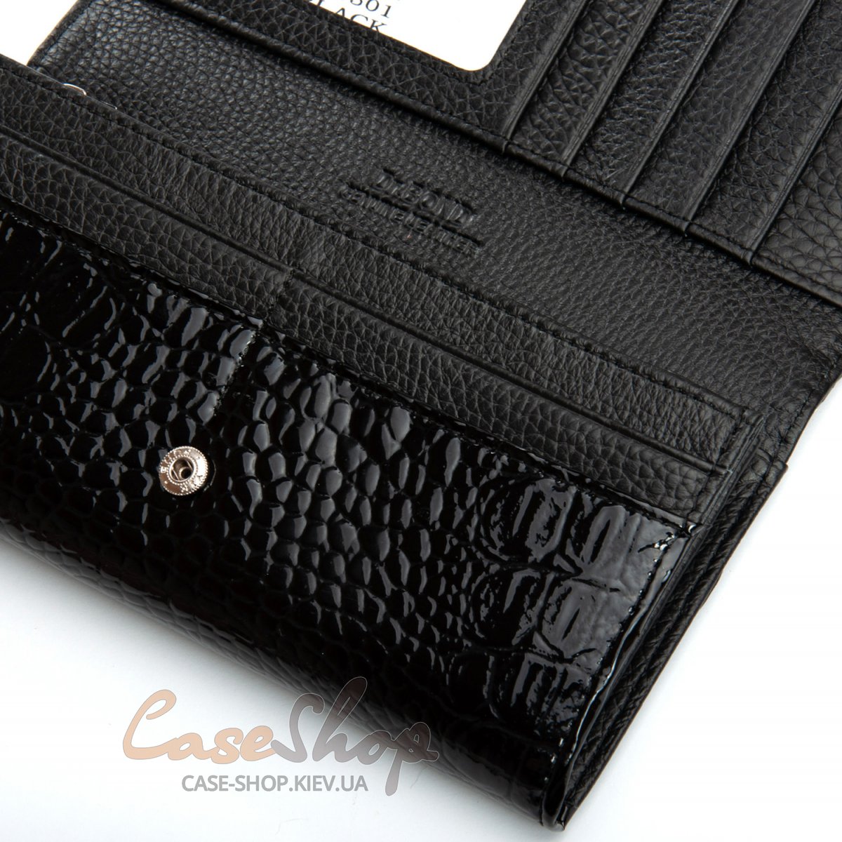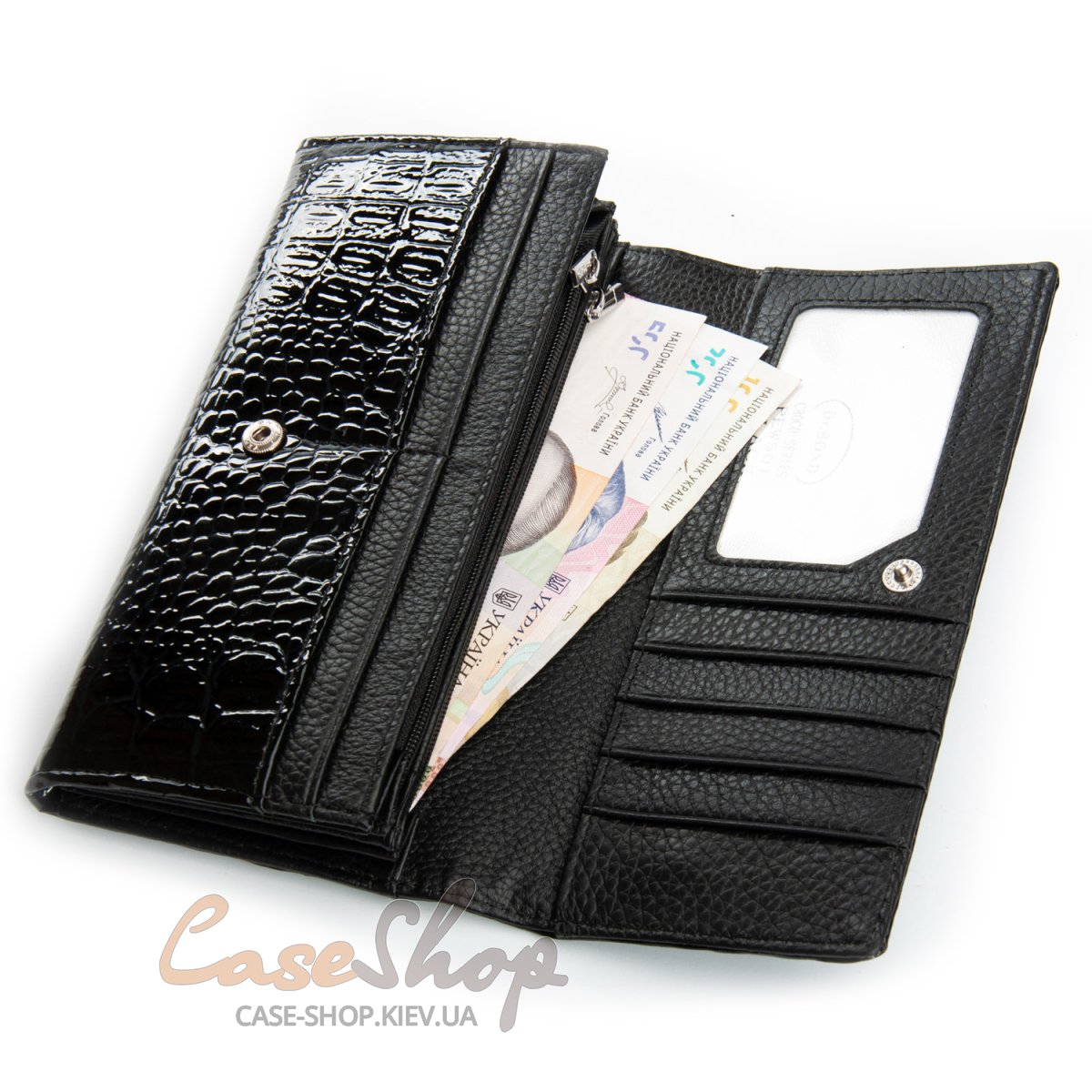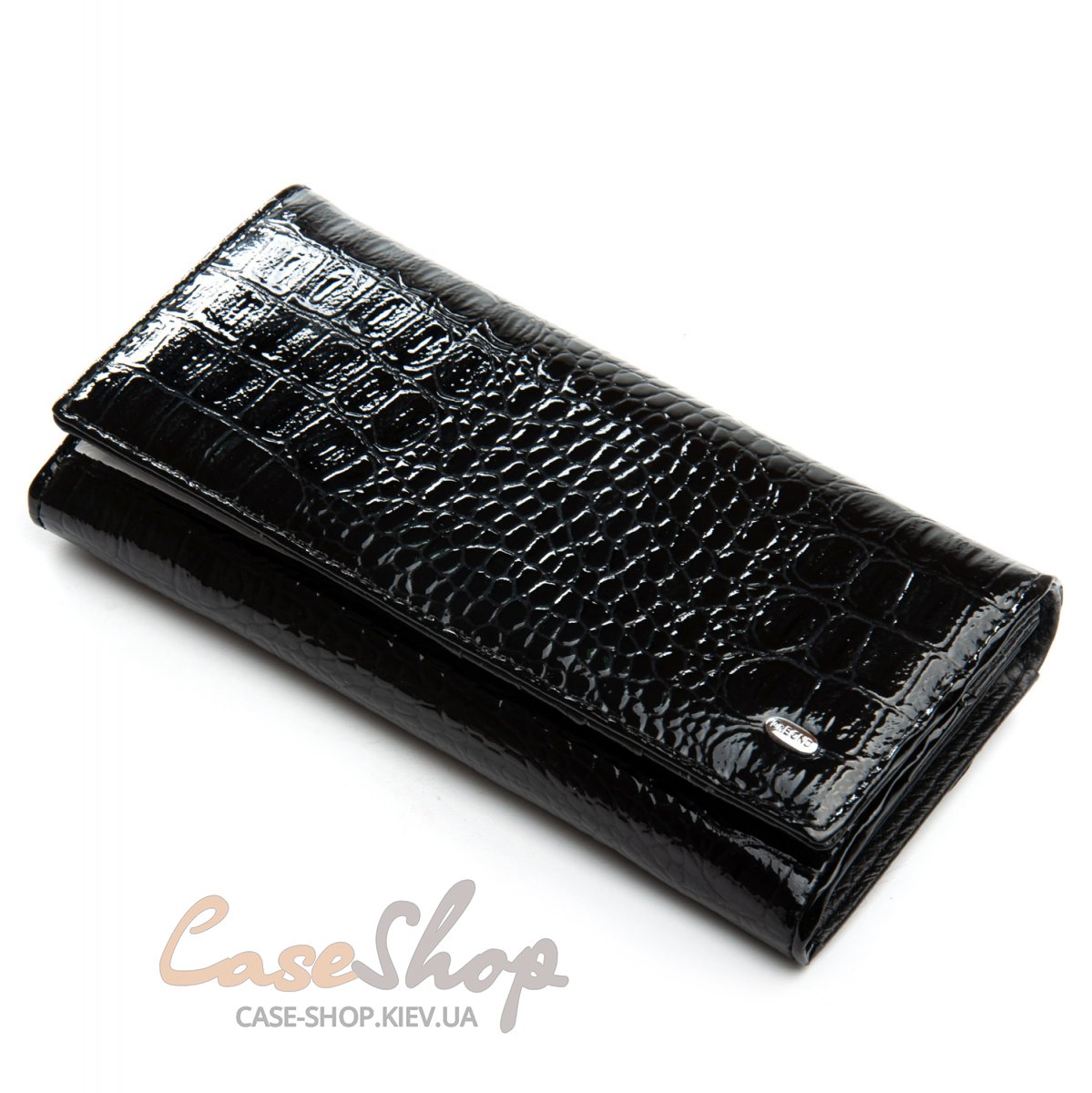 Великий полегшений жіночий гаманець Dr.Bond серії Croco . Виготовлений із натуральної лакової шкіри. Закривається на кнопку. Усередині знаходяться 4 відділення для банкнот, дві кишені-монетниці на блискавці, велика відкрита кишеня та 9 кишень для карток та візиток. Зовні гаманець на звороті має кишеню на блискавці.