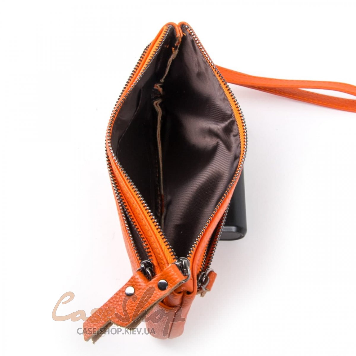 Зручна шкіряна косметичка. Одне основне відділення із кишенею, закривається на блискавку. На передній та зворотній стороні є великі кишені на блискавці. У комплекті є коротка кистьова ручка.